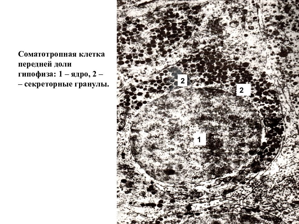 Соматотропная клетка передней доли гипофиза: 1 – ядро, 2 – – секреторные гранулы. 1 2 2