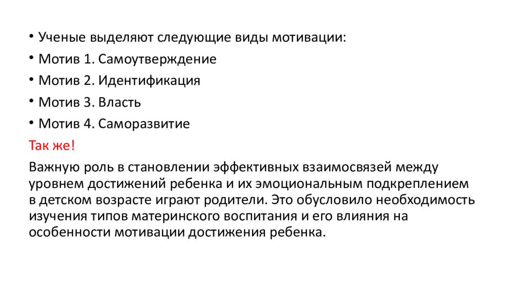 Ученые выделяют следующие виды мотивации: Мотив 1. Самоутверждение Мотив 2. Идентификация Мотив 3. Власть Мотив 4. Саморазвитие Так же! Важную роль в становлении эффективных взаимосвязей между уровнем достижений ребенка и их эмоциональным подкреплением в детском возрасте играют родители. Это обусловило необходимость изучения типов материнского воспитания и его влияния на особенности мотивации достижения ребенка.