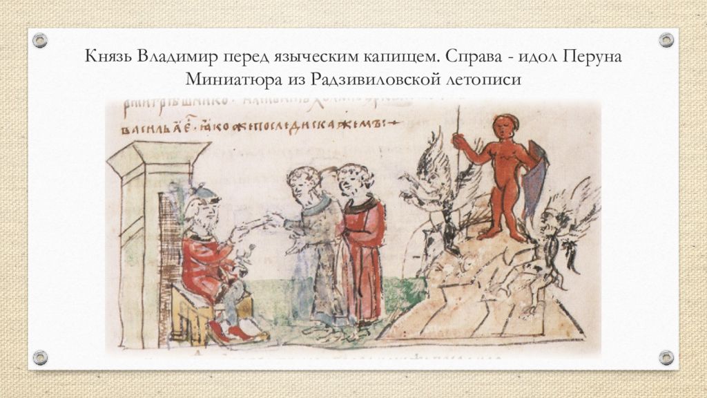 Князь Владимир перед языческим капищем. Справа - идол Перуна Миниатюра из Радзивиловской летописи
