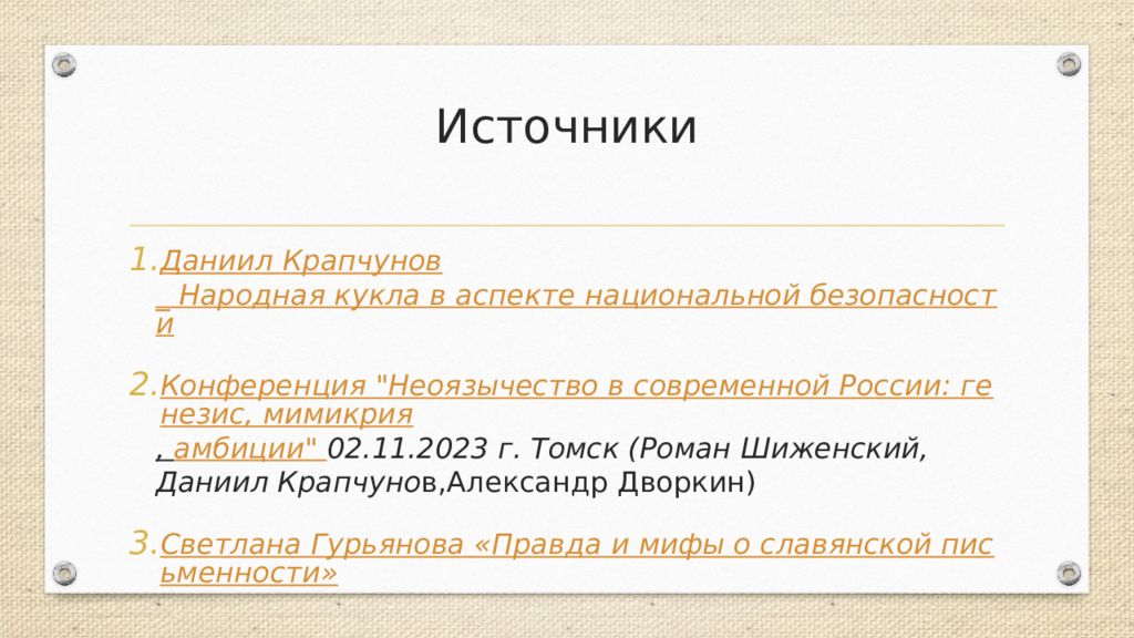 Даниил Крапчунов _ Народная кукла в аспекте национальной безопасности Конференция "Неоязычество в современной России: генезис, мимикрия, амбиции" 02.11.2023 г. Томск (Роман Шиженский, Даниил Крапчуно в,Александр Дворкин) Светлана Гурьянова «Правда и мифы о славянской письменности»