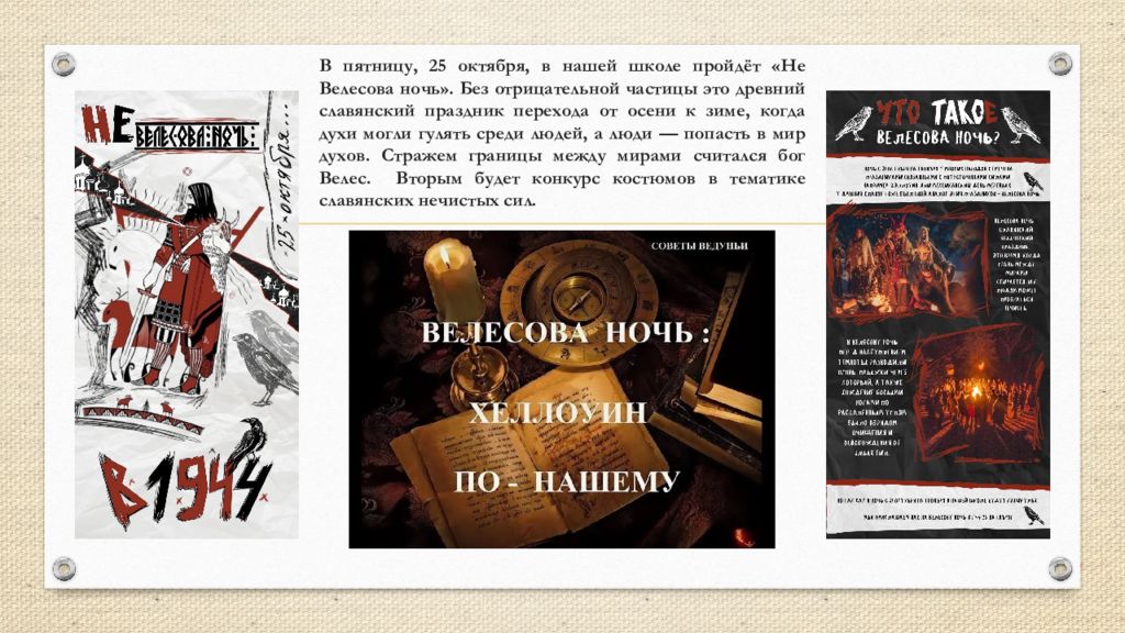 Слайд 14: В пятницу, 25 октября, в нашей школе пройдёт «Не Велесова ночь». Без отрицательной частицы это древний славянский праздник перехода от осени к зиме, когда духи могли гулять среди людей, а люди — попасть в мир духов. Стражем границы между мирами считался бог Велес. Вторым будет конкурс костюмов в тематике славянских нечистых сил
