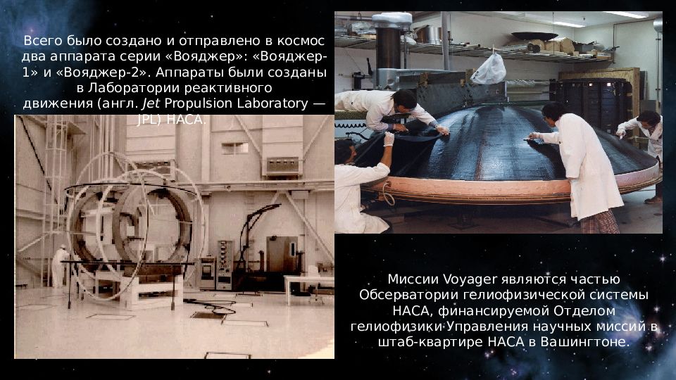 Миссии Voyager являются частью Обсерватории гелиофизической системы НАСА, финансируемой Отделом гелиофизики Управления научных миссий в штаб-квартире НАСА в Вашингтоне. Всего было создано и отправлено в космос два аппарата серии «Вояджер»: «Вояджер-1» и «Вояджер-2 ». Аппараты были созданы в Лаборатории реактивного движения (англ. Jet Propulsion Laboratory — JPL) НАСА.