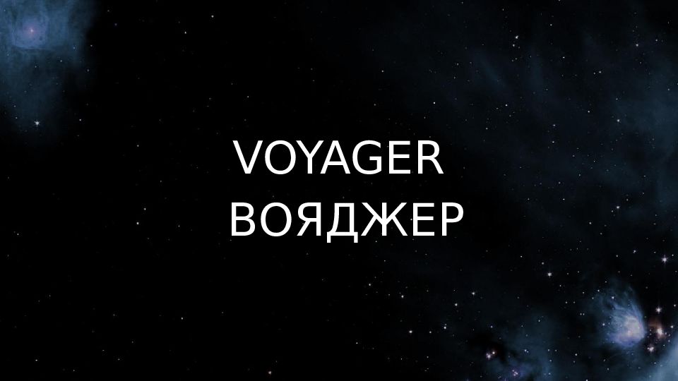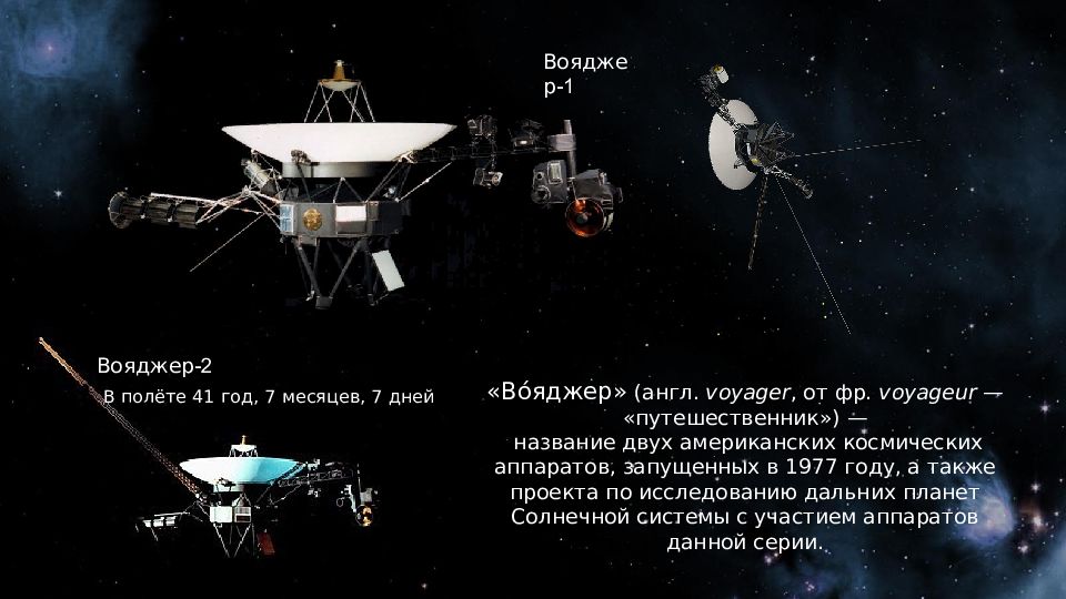 «Во́яджер» (англ. voyager, от фр. voyageur — «путешественник») — название двух американских космических аппаратов, запущенных в 1977 году, а также проекта по исследованию дальних планет Солнечной системы с участием аппаратов данной серии. Вояджер - 1 Вояджер -2 В полёте 41 год, 7 месяцев, 7 дней