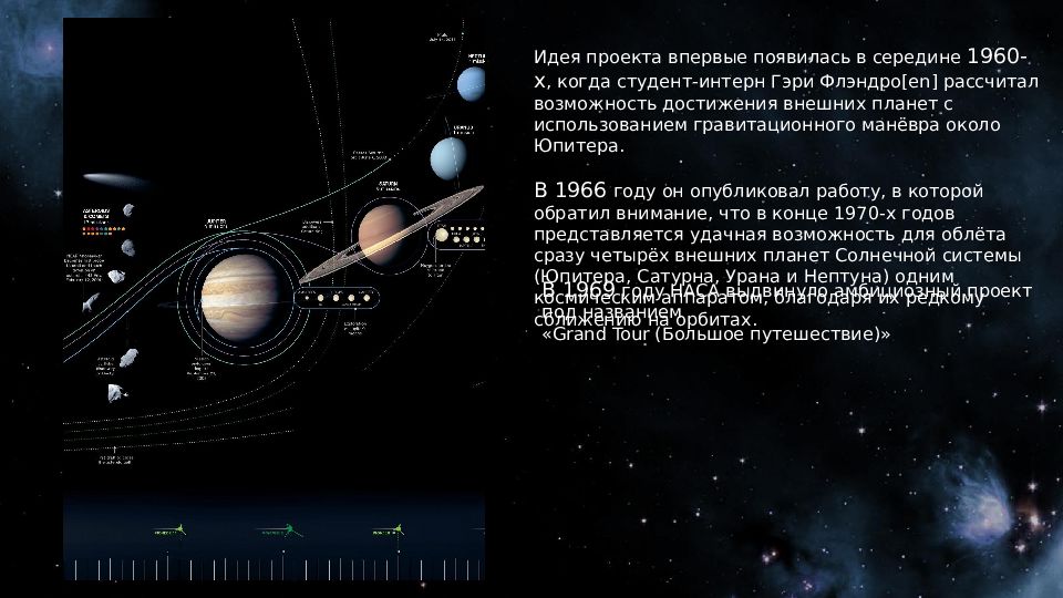 Идея проекта впервые появилась в середине 1960-х, когда студент-интерн Гэри Флэндро [ en ] рассчитал возможность достижения внешних планет с использованием гравитационного манёвра около Юпитера. В 1966 году он опубликовал работу, в которой обратил внимание, что в конце 1970-х годов представляется удачная возможность для облёта сразу четырёх внешних планет Солнечной системы (Юпитера, Сатурна, Урана и Нептуна) одним космическим аппаратом, благодаря их редкому сближению на орбитах. В 1969 году НАСА выдвинуло амбициозный проект под названием « Grand Tour (Большое путешествие)»