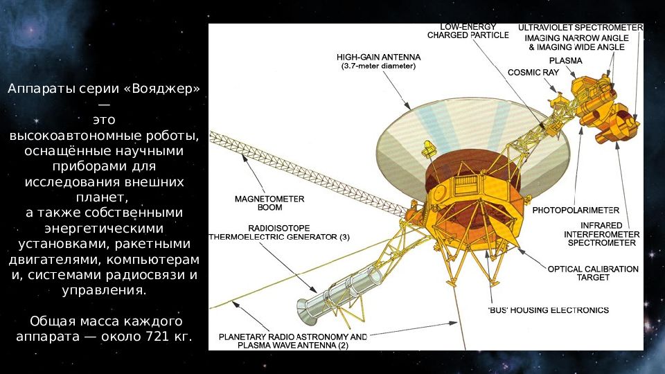 Аппараты серии «Вояджер » — это высокоавтономные роботы, оснащённые научными приборами для исследования внешних планет, а также собственными энергетическими установками, ракетными двигателями, компьютерами, системами радиосвязи и управления. Общая масса каждого аппарата — около 721 кг.
