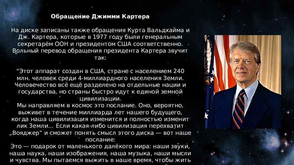 Обращение Джимми Картера На диске записаны также обращения Курта Вальдхайма и Дж. Картера, которые в 1977 году были генеральным секретарём ООН и президентом США соответственно. Вольный перевод обращения президента Картера звучит так : “Этот аппарат создан в США, стране с населением 240 млн. человек среди 4-миллиардного населения Земли. Человечество всё ещё разделено на отдельные нации и государства, но страны быстро идут к единой земной цивилизации. Мы направляем в космос это послание. Оно, вероятно, выживет в течение миллиарда лет нашего будущего, когда наша цивилизация изменится и полностью изменит лик Земли… Если какая-либо цивилизация перехватит „Вояджер“ и сможет понять смысл этого диска — вот наше послание: Это — подарок от маленького далёкого мира: наши звуки, наша наука, наши изображения, наша музыка, наши мысли и чувства. Мы пытаемся выжить в наше время, чтобы жить и в вашем. Мы надеемся, настанет день, когда будут решены проблемы, перед которыми мы стоим сегодня, и мы присоединимся к галактической цивилизации. Эти записи представляют наши надежды, нашу решимость и нашу добрую волю в этой Вселенной, огромной и внушающей благоговение.”