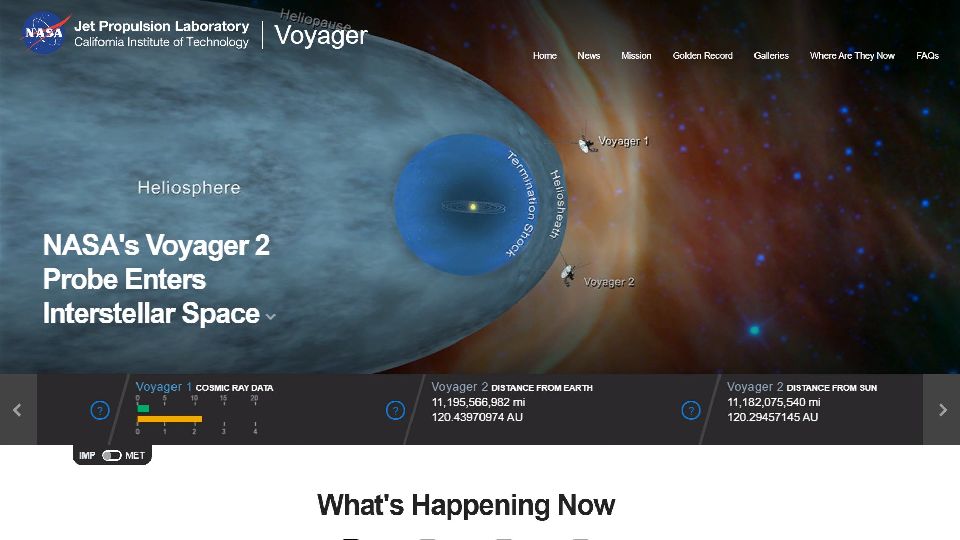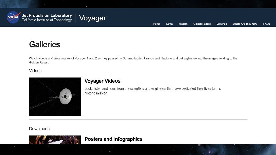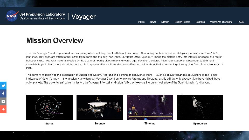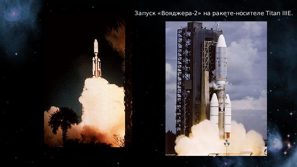 «Вояджер-1» (англ. Voyager-1) — автоматическая межпланетная станция, исследующая Солнечную систему с 5 сентября 1977 года. Основная миссия космической программы «Вояджер» заключалась в исследовании Юпитера и Сатурна. Последняя цель «Вояджера-1» — исследование гелиопаузы. «Вояджер-1» стал первым зондом, передавшим информацию об условиях, царящих в межзвёздной среде. «Вояджер-2» — действующий космический аппарат, запущенный НАСА 20 августа 1977 года в рамках программы «Вояджер» для исследований дальних планет Солнечной системы. Первый и единственный аппарат, достигший Урана (в январе 1986 года) и Нептуна (в августе 1989 года).