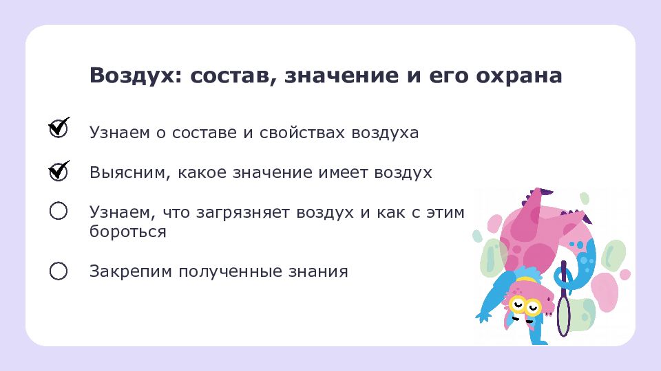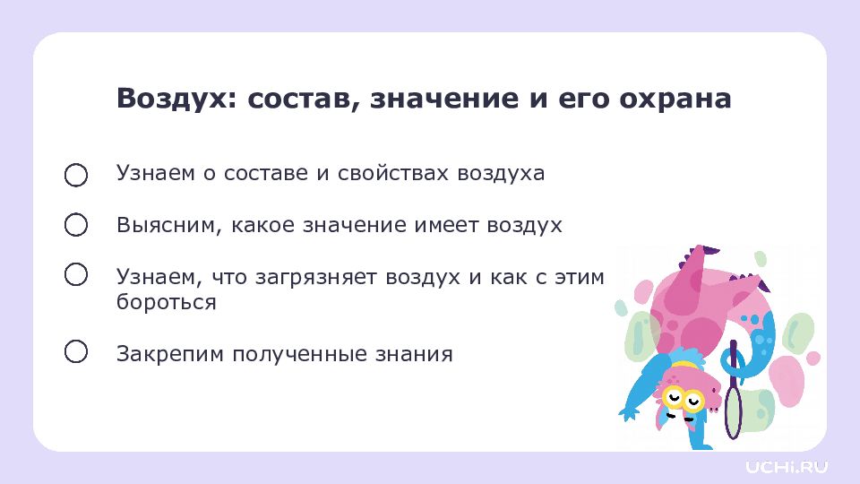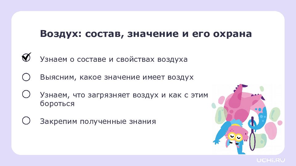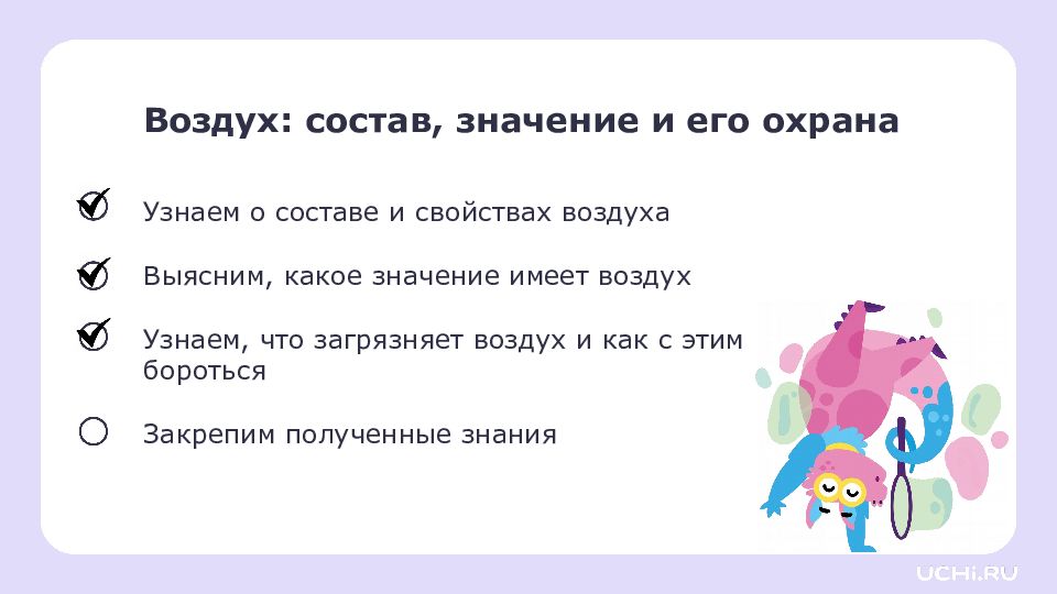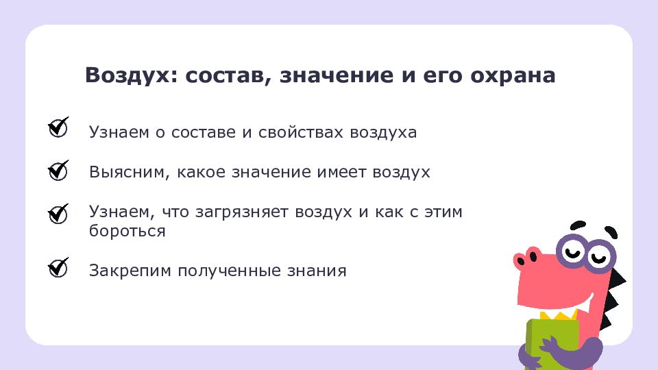Воздух: состав, значение и его охрана Узнаем о составе и свойствах воздуха Выясним, какое значение имеет воздух Узнаем, что загрязняет воздух и как с этим бороться Закрепим полученные знания