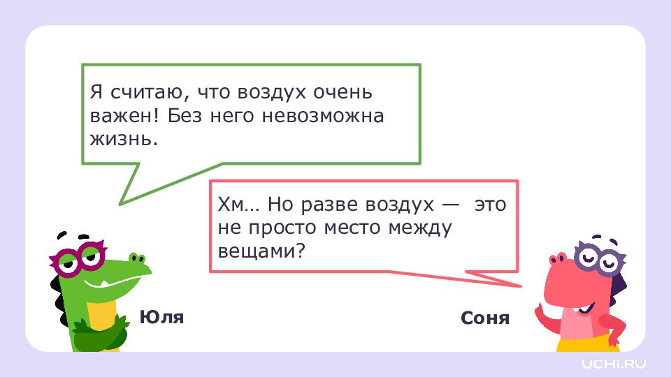 Я считаю, что воздух очень важен! Без него невозможна жизнь. Хм… Но разве воздух — это не просто место между вещами? Юля Соня