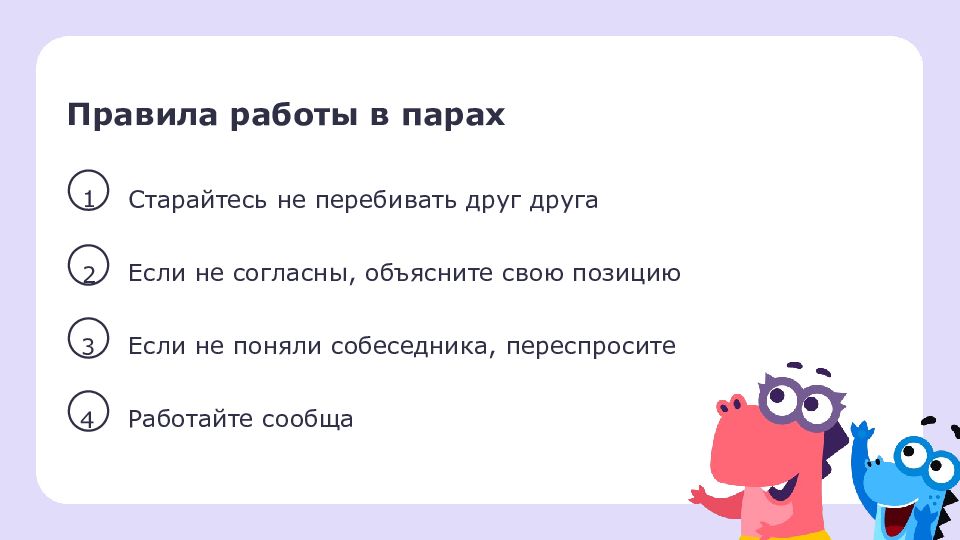 Правила работы в парах 1 2 Если не согласны, объясните свою позицию 3 Если не поняли собеседника, переспросите 4 Работайте сообща Старайтесь не перебивать друг друга