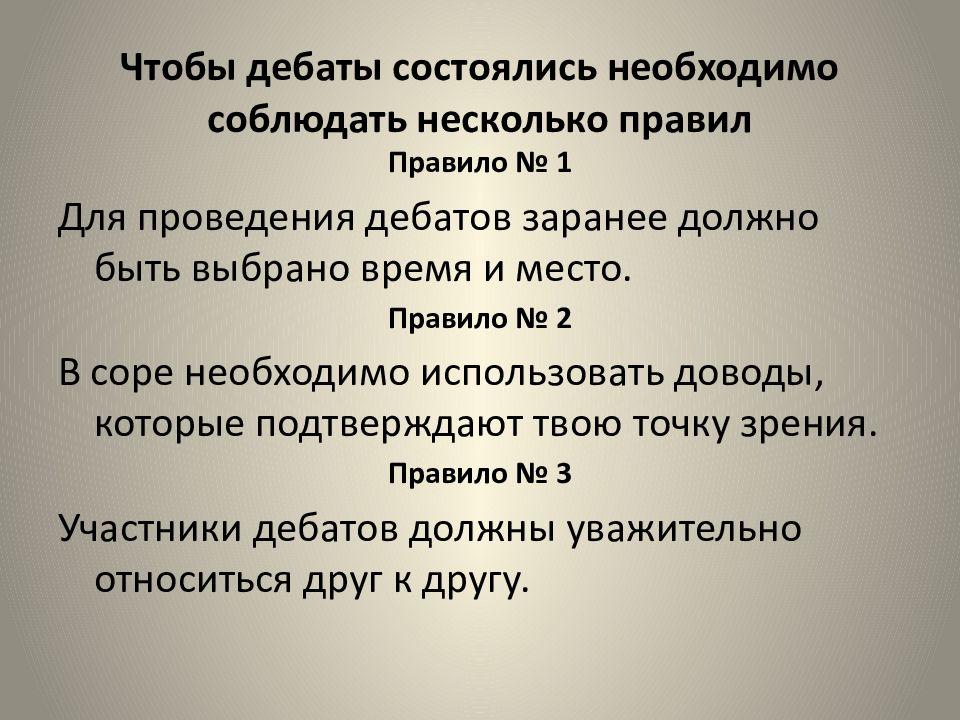 Правило № 1 Для проведения дебатов заранее должно быть выбрано время и место. Правило № 2 В соре необходимо использовать доводы, которые подтверждают твою точку зрения. Правило № 3 Участники дебатов должны уважительно относиться друг к другу.