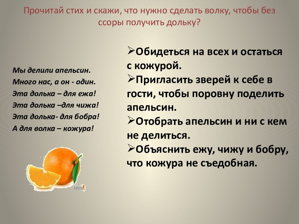 Мы делили апельсин. Много нас, а он - один. Эта долька – для ежа! Эта долька –для чижа! Эта долька- для бобра! А для волка – кожура! Обидеться на всех и остаться с кожурой. Пригласить зверей к себе в гости, чтобы поровну поделить апельсин. Отобрать апельсин и ни с кем не делиться. Объяснить ежу, чижу и бобру, что кожура не съедобная.