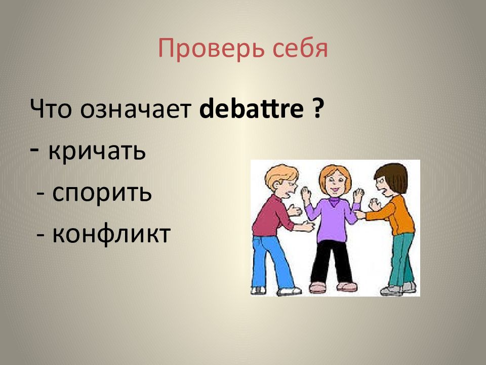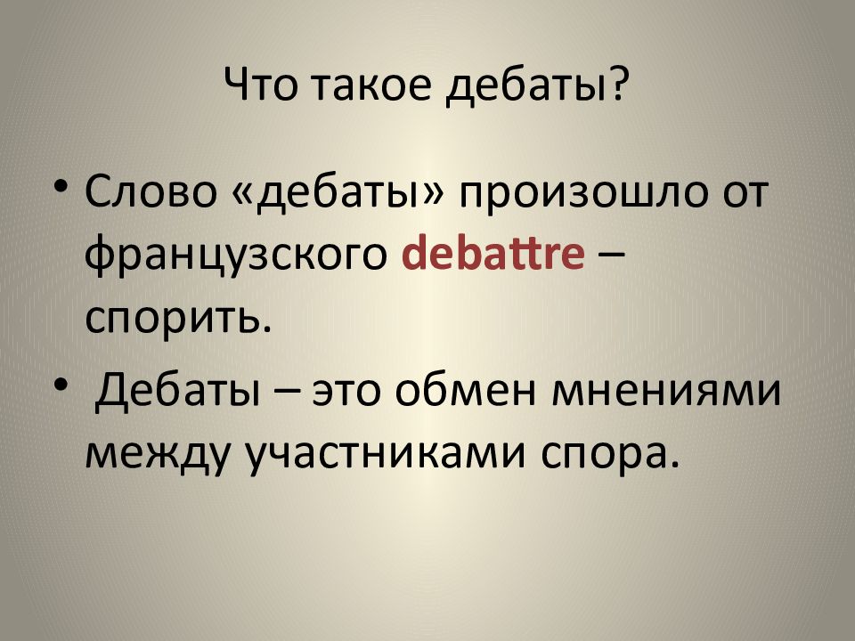 Слово «дебаты» произошло от французского debattre – спорить. Дебаты – это обмен мнениями между участниками спора.