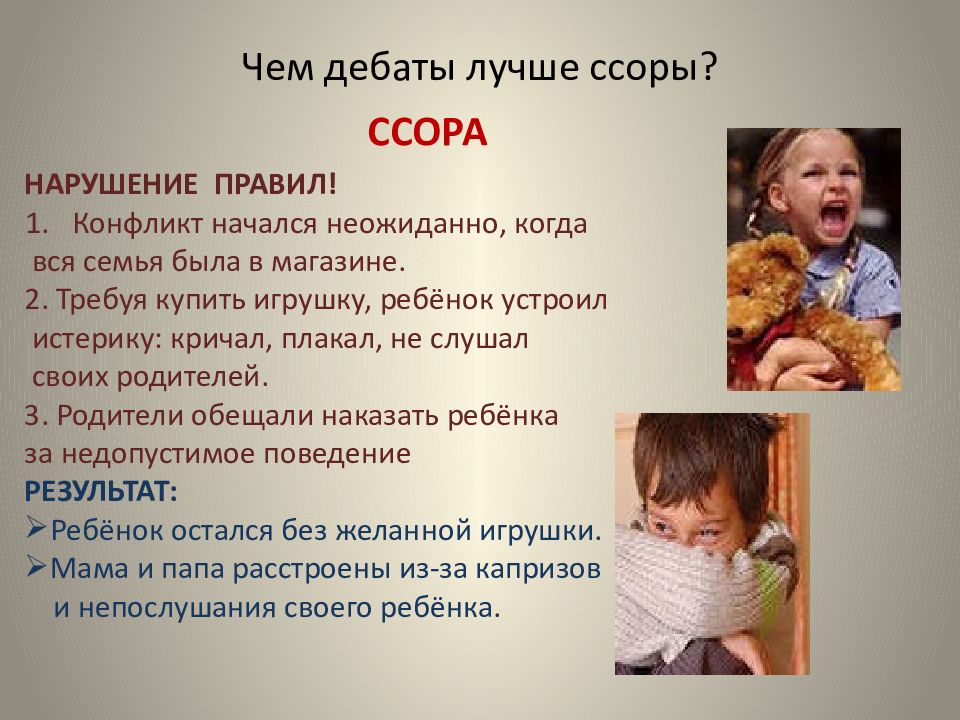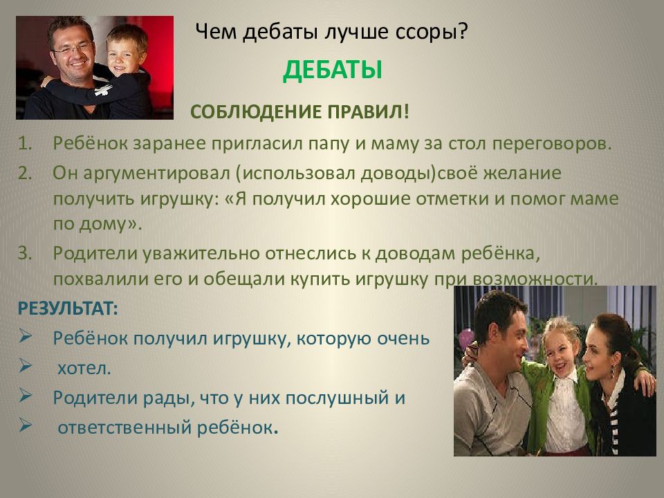 ДЕБАТЫ СОБЛЮДЕНИЕ ПРАВИЛ! Ребёнок заранее пригласил папу и маму за стол переговоров. Он аргументировал (использовал доводы)своё желание получить игрушку: «Я получил хорошие отметки и помог маме по дому». Родители уважительно отнеслись к доводам ребёнка, похвалили его и обещали купить игрушку при возможности. РЕЗУЛЬТАТ: Ребёнок получил игрушку, которую очень хотел. Родители рады, что у них послушный и ответственный ребёнок.