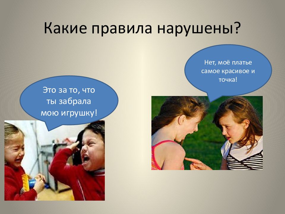 Играя в футбол, один мальчик нарушил правила. За это команда выгнала его с поля. Саша попросил поделиться сестрёнку с ним конфетой, предложив взамен покататься на велосипеде. Даша согласилась. Катя без спросу взяла куколку у подруги. Узнав об этом, Маша пригласила Катю и объяснила, что кукла – подарок, который ей очень дорог. Катя вернула куколку. Витя дёрнул за косичку Таню. Девочка обиделась на него и заплакала.