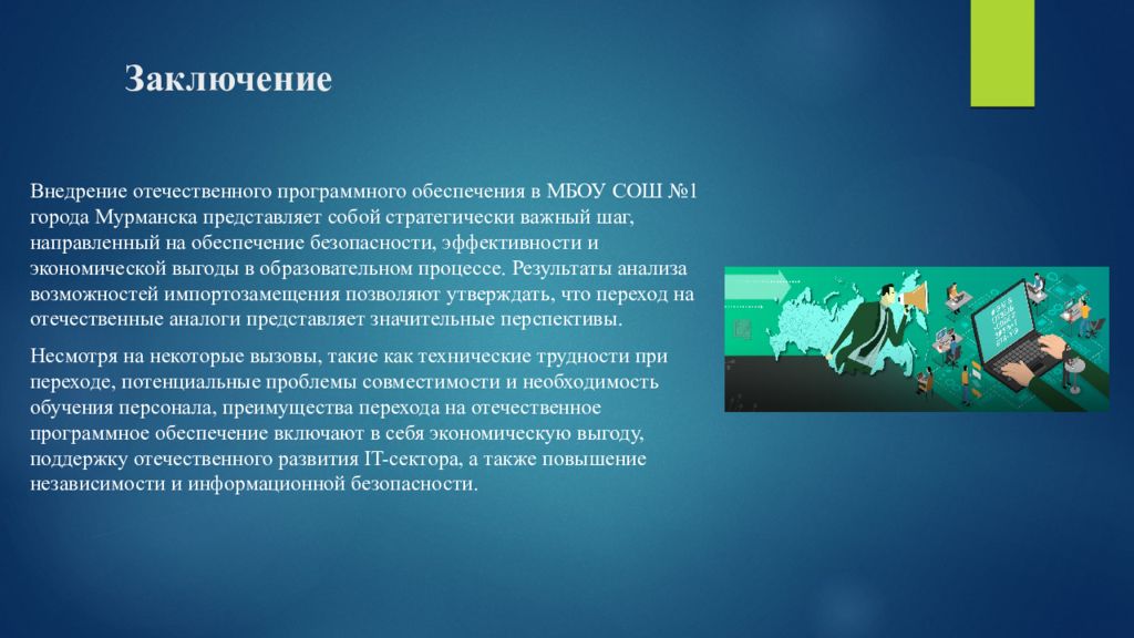 Внедрение отечественного программного обеспечения в МБОУ СОШ №1 города Мурманска представляет собой стратегически важный шаг, направленный на обеспечение безопасности, эффективности и экономической выгоды в образовательном процессе. Результаты анализа возможностей импортозамещения позволяют утверждать, что переход на отечественные аналоги представляет значительные перспективы. Несмотря на некоторые вызовы, такие как технические трудности при переходе, потенциальные проблемы совместимости и необходимость обучения персонала, преимущества перехода на отечественное программное обеспечение включают в себя экономическую выгоду, поддержку отечественного развития IT-сектора, а также повышение независимости и информационной безопасности.