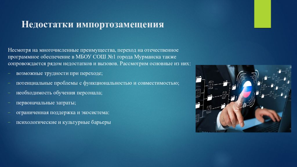 Несмотря на многочисленные преимущества, переход на отечественное программное обеспечение в МБОУ СОШ №1 города Мурманска также сопровождается рядом недостатков и вызовов. Рассмотрим основные из них: в озможные трудности при переходе ; п отенциальные проблемы с функциональностью и совместимостью ; н еобходимость обучения персонала ; п ервоначальные затраты ; о граниченная поддержка и экосистема : п сихологические и культурные барьеры