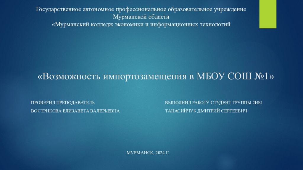 Проверил преподаватель выполнил работу студент группы 2иб1 Вострикова елизавета валерьевна Танасийчук Дмитрий Сергеевич Мурманск, 2024 г. Государственное автономное профессиональное образовательное учреждение Мурманской области «Мурманский колледж экономики и информационных технологий