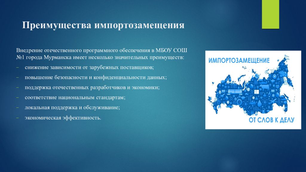 Внедрение отечественного программного обеспечения в МБОУ СОШ №1 города Мурманска имеет несколько значительных преимуществ: с нижение зависимости от зарубежных поставщиков ; повышение безопасности и конфиденциальности данных ; п оддержка отечественных разработчиков и экономики ; с оответствие национальным стандартам ; л окальная поддержка и обслуживание ; э кономическая эффективность.