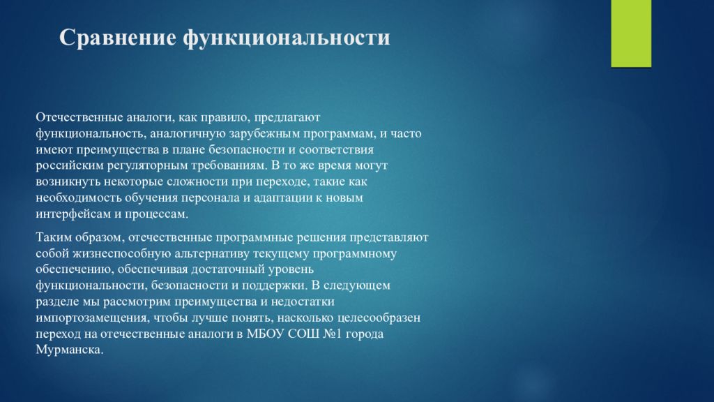 Отечественные аналоги, как правило, предлагают функциональность, аналогичную зарубежным программам, и часто имеют преимущества в плане безопасности и соответствия российским регуляторным требованиям. В то же время могут возникнуть некоторые сложности при переходе, такие как необходимость обучения персонала и адаптации к новым интерфейсам и процессам. Таким образом, отечественные программные решения представляют собой жизнеспособную альтернативу текущему программному обеспечению, обеспечивая достаточный уровень функциональности, безопасности и поддержки. В следующем разделе мы рассмотрим преимущества и недостатки импортозамещения, чтобы лучше понять, насколько целесообразен переход на отечественные аналоги в МБОУ СОШ №1 города Мурманска.
