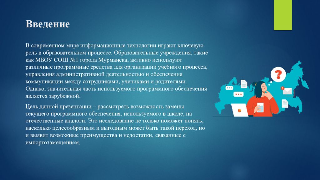 В современном мире информационные технологии играют ключевую роль в образовательном процессе. Образовательные учреждения, такие как МБОУ СОШ №1 города Мурманска, активно используют различные программные средства для организации учебного процесса, управления административной деятельностью и обеспечения коммуникации между сотрудниками, учениками и родителями. Однако, значительная часть используемого программного обеспечения является зарубежной. Цель данной презентации – рассмотреть возможность замены текущего программного обеспечения, используемого в школе, на отечественные аналоги. Это исследование не только поможет понять, насколько целесообразным и выгодным может быть такой переход, но и выявит возможные преимущества и недостатки, связанные с импортозамещением.