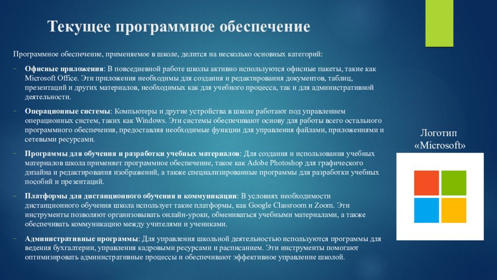 Программное обеспечение, применяемое в школе, делится на несколько основных категорий: Офисные приложения : В повседневной работе школы активно используются офисные пакеты, такие как Microsoft Office. Эти приложения необходимы для создания и редактирования документов, таблиц, презентаций и других материалов, необходимых как для учебного процесса, так и для административной деятельности. Операционные системы : Компьютеры и другие устройства в школе работают под управлением операционных систем, таких как Windows. Эти системы обеспечивают основу для работы всего остального программного обеспечения, предоставляя необходимые функции для управления файлами, приложениями и сетевыми ресурсами. Программы для обучения и разработки учебных материалов : Для создания и использования учебных материалов школа применяет программное обеспечение, такое как Adobe Photoshop для графического дизайна и редактирования изображений, а также специализированные программы для разработки учебных пособий и презентаций. Платформы для дистанционного обучения и коммуникации : В условиях необходимости дистанционного обучения школа использует такие платформы, как Google Classroom и Zoom. Эти инструменты позволяют организовывать онлайн-уроки, обмениваться учебными материалами, а также обеспечивать коммуникацию между учителями и учениками. Административные программы : Для управления школьной деятельностью используются программы для ведения бухгалтерии, управления кадровыми ресурсами и расписанием. Эти инструменты помогают оптимизировать административные процессы и обеспечивают эффективное управление школой. Логотип « Microsoft »