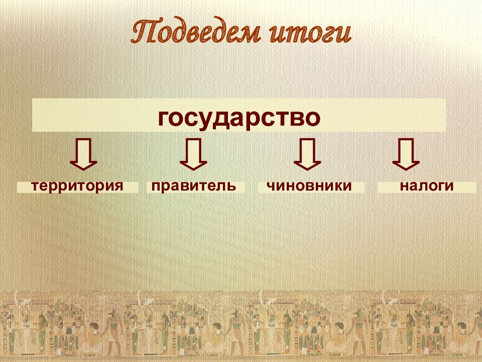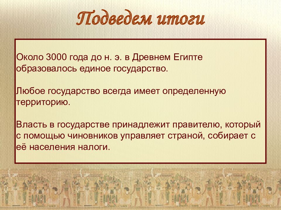 Около 3000 года до н. э. в Древнем Египте образовалось единое государство. Любое государство всегда имеет определенную территорию. Власть в государстве принадлежит правителю, который с помощью чиновников управляет страной, собирает с её населения налоги. Подведем итоги