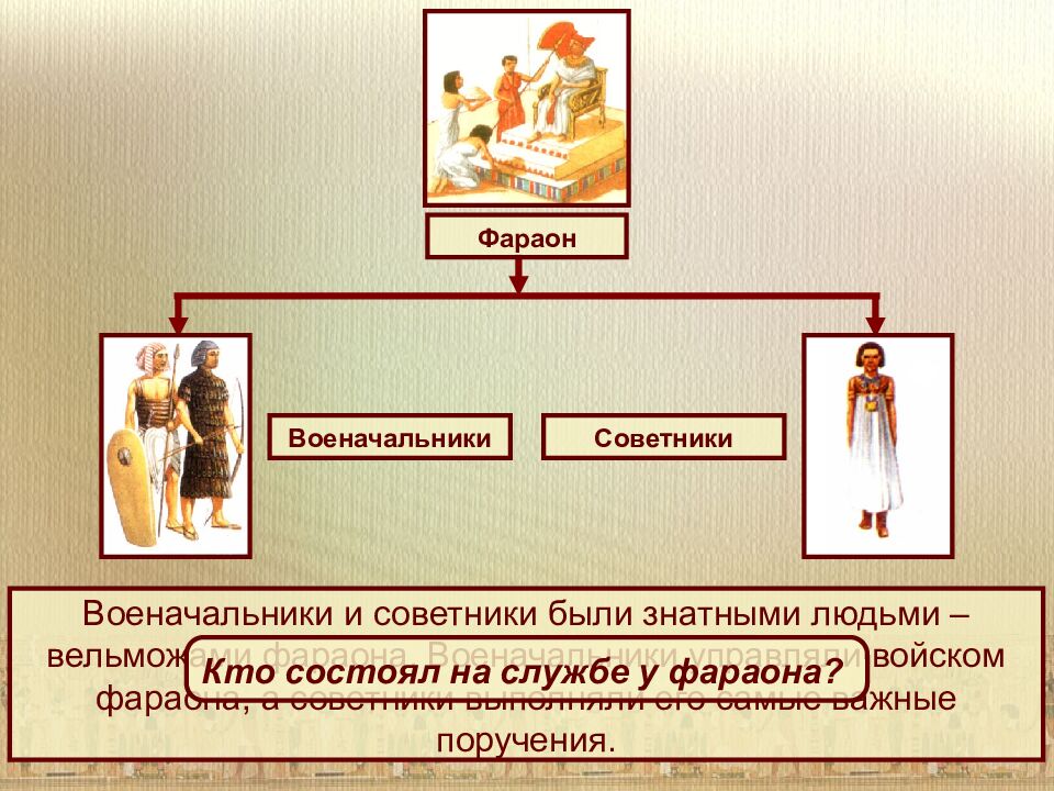 Военачальники и советники были знатными людьми – вельможами фараона. Военачальники управляли войском фараона, а советники выполняли его самые важные поручения. Военачальники Советники Фараон Кто состоял на службе у фараона?