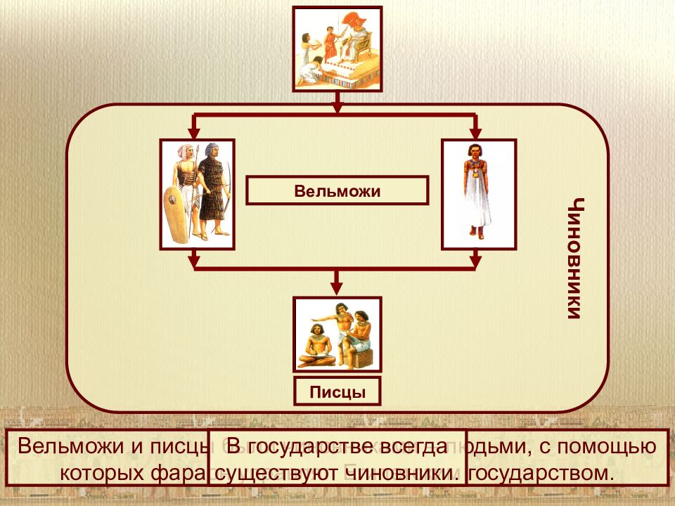 Чиновники Вельможи Вельможи и писцы были чиновниками – людьми, с помощью которых фараон управлял Египетским государством. Писцы В государстве всегда существуют чиновники.