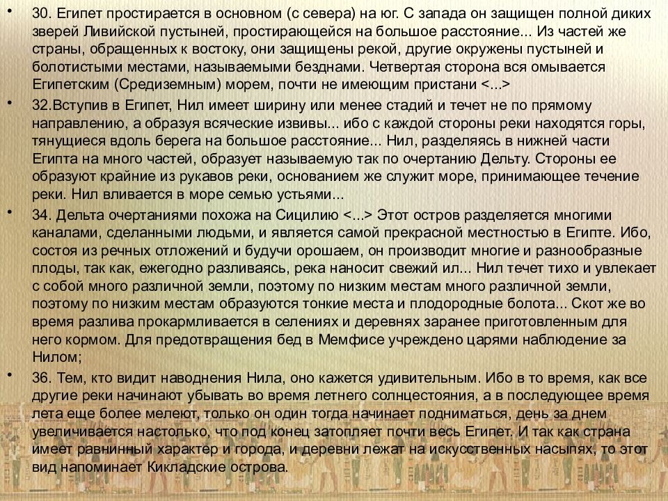 30. Египет простирается в основном (с севера) на юг. С запада он защищен полной диких зверей Ливийской пустыней, простирающейся на большое расстояние... Из частей же страны, обращенных к востоку, они защищены рекой, другие окружены пустыней и болотистыми местами, называемыми безднами. Четвертая сторона вся омывается Египетским (Средиземным) морем, почти не имеющим пристани <...> 32.Вступив в Египет, Нил имеет ширину или менее стадий и течет не по прямому направлению, а образуя всяческие извивы... ибо с каждой стороны реки находятся горы, тянущиеся вдоль берега на большое расстояние... Нил, разделяясь в нижней части Египта на много частей, образует называемую так по очертанию Дельту. Стороны ее образуют крайние из рукавов реки, основанием же служит море, принимающее течение реки. Нил вливается в море семью устьями... 34. Дельта очертаниями похожа на Сицилию <...> Этот остров разделяется многими каналами, сделанными людьми, и является самой прекрасной местностью в Египте. Ибо, состоя из речных отложений и будучи орошаем, он производит многие и разнообразные плоды, так как, ежегодно разливаясь, река наносит свежий ил... Нил течет тихо и увлекает с собой много различной земли, поэтому по низким местам много различной земли, поэтому по низким местам образуются тонкие места и плодородные болота... Скот же во время разлива прокармливается в селениях и деревнях заранее приготовленным для него кормом. Для предотвращения бед в Мемфисе учреждено царями наблюдение за Нилом; 36. Тем, кто видит наводнения Нила, оно кажется удивительным. Ибо в то время, как все другие реки начинают убывать во время летнего солнцестояния, а в последующее время лета еще более мелеют, только он один тогда начинает подниматься, день за днем увеличивается настолько, что под конец затопляет почти весь Египет. И так как страна имеет равнинный характер и города, и деревни лежат на искусственных насыпях, то этот вид напоминает Кикладские острова.