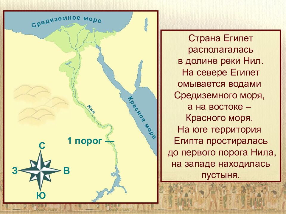 Страна Египет располагалась в долине реки Нил. На севере Египет омывается водами Средиземного моря, а на востоке – Красного моря. На юге территория Египта простиралась до первого порога Нила, на западе находилась пустыня. C З В Ю 1 порог —