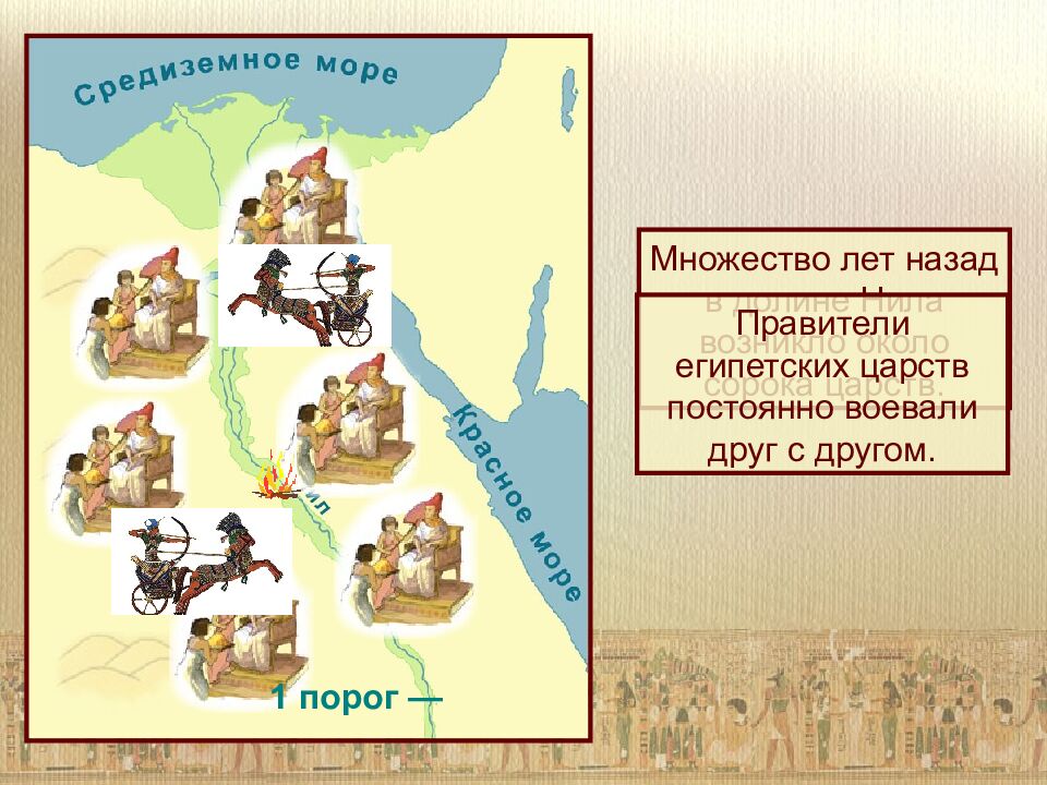 Множество лет назад в долине Нила возникло около сорока царств. Правители египетских царств постоянно воевали друг с другом. 1 порог —