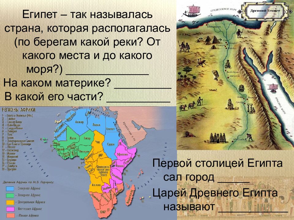Последний слайд презентации: Возникновение государства в Древнем Египте: Египет – так называлась страна, которая располагалась (по берегам какой реки? От какого места и до какого моря?) На каком материке? В какой его части?