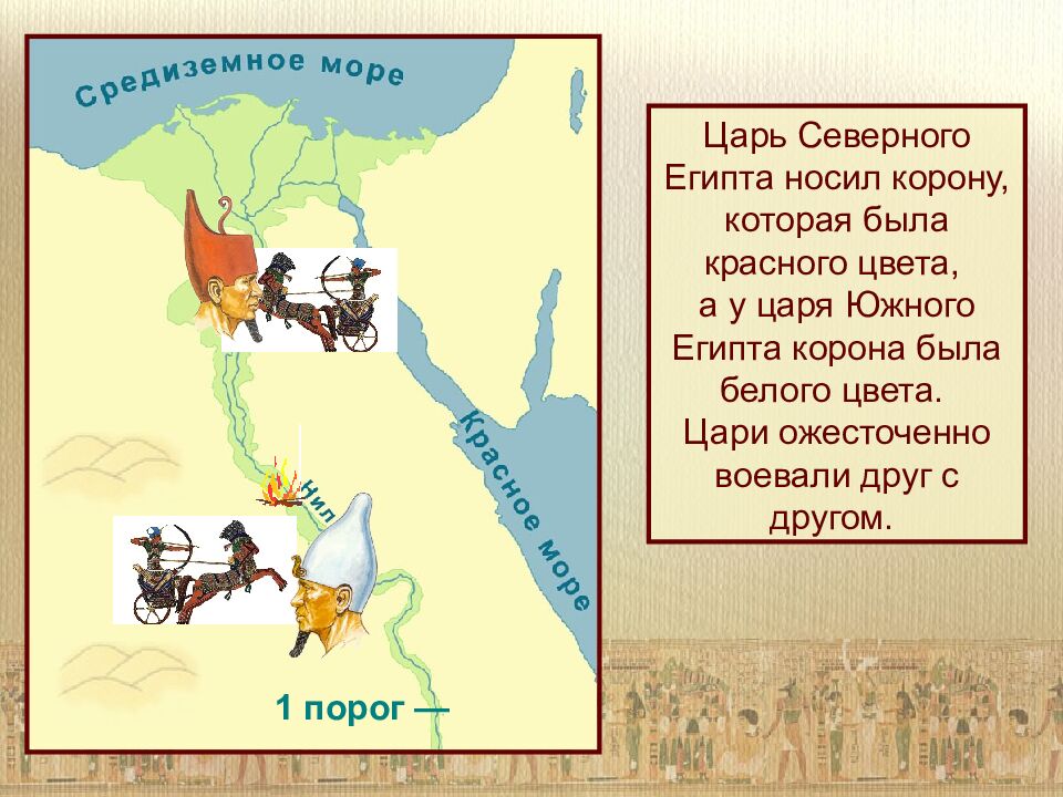1 порог — Царь Северного Египта носил корону, которая была красного цвета, а у царя Южного Египта корона была белого цвета. Цари ожесточенно воевали друг с другом.