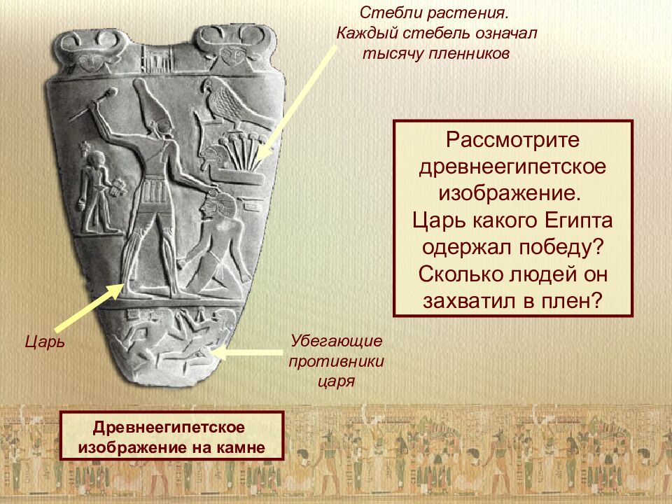 Древнеегипетское изображение на камне Стебли растения. Каждый стебель означал тысячу пленников Царь Рассмотрите древнеегипетское изображение. Царь какого Египта одержал победу? Сколько людей он захватил в плен? Убегающие противники царя