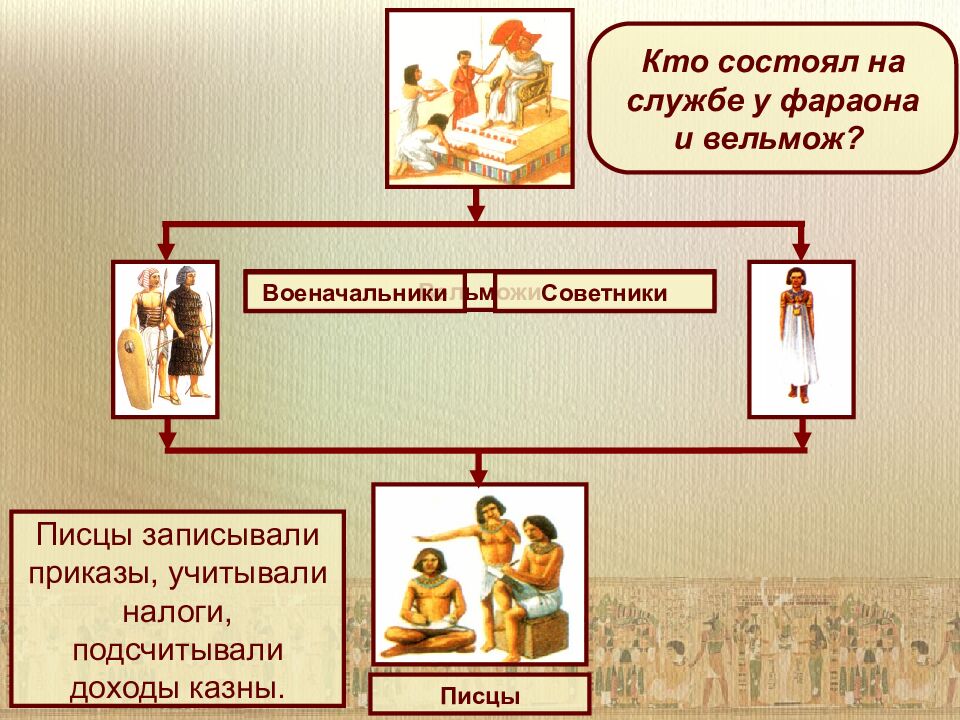 Вельможи Писцы записывали приказы, учитывали налоги, подсчитывали доходы казны. Военачальники Советники Кто состоял на службе у фараона и вельмож? Писцы