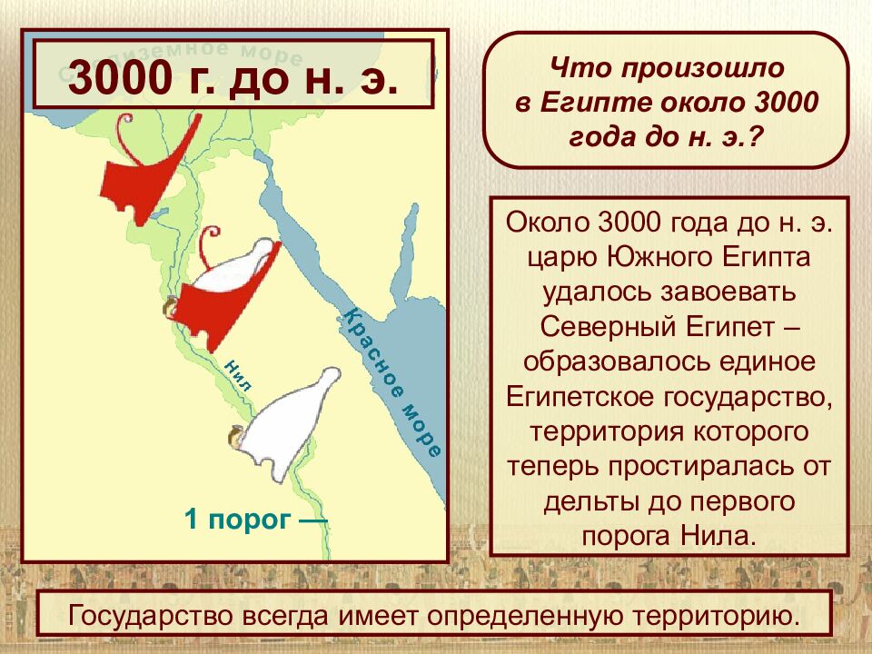 1 порог — Около 3000 года до н. э. царю Южного Египта удалось завоевать Северный Египет – образовалось единое Египетское государство, территория которого теперь простиралась от дельты до первого порога Нила. Что произошло в Египте около 3000 года до н. э.? Государство всегда имеет определенную территорию. 3000 г. до н. э.
