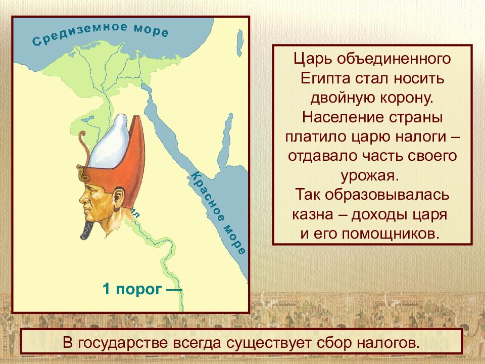 1 порог — Царь объединенного Египта стал носить двойную корону. Население страны платило царю налоги – отдавало часть своего урожая. Так образовывалась казна – доходы царя и его помощников. В государстве всегда существует сбор налогов.
