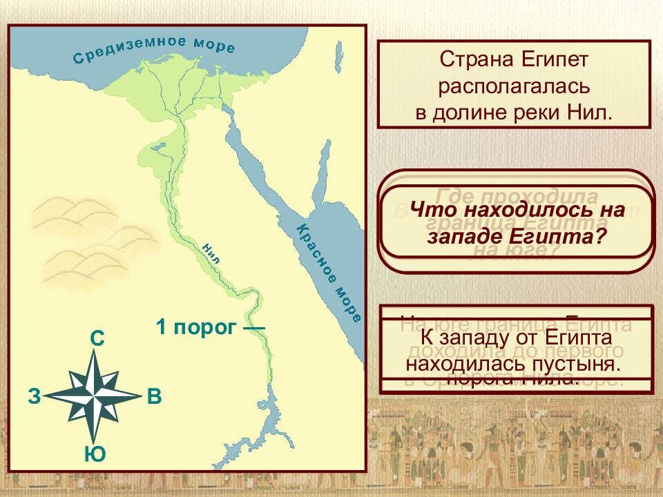 С востока Египет омывается водами Красного моря. Какое море омывает берега Египта на востоке? Страна Египет располагалась в долине реки Нил. В какое море впадает Нил? C З В Ю На севере река Нил впадает в Средиземное море. Где проходила граница Египта на юге? На юге граница Египта доходила до первого порога Нила. Что находилось на западе Египта? К западу от Египта находилась пустыня. 1 порог —