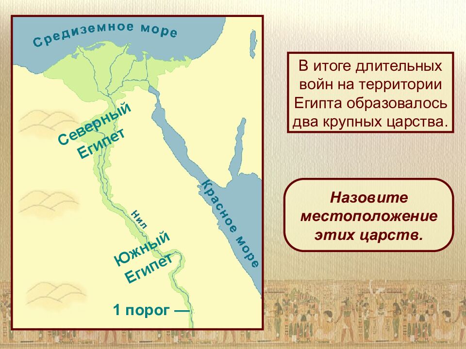 1 порог — В итоге длительных войн на территории Египта образовалось два крупных царства. Назовите местоположение этих царств. Северный Египет Южный Египет