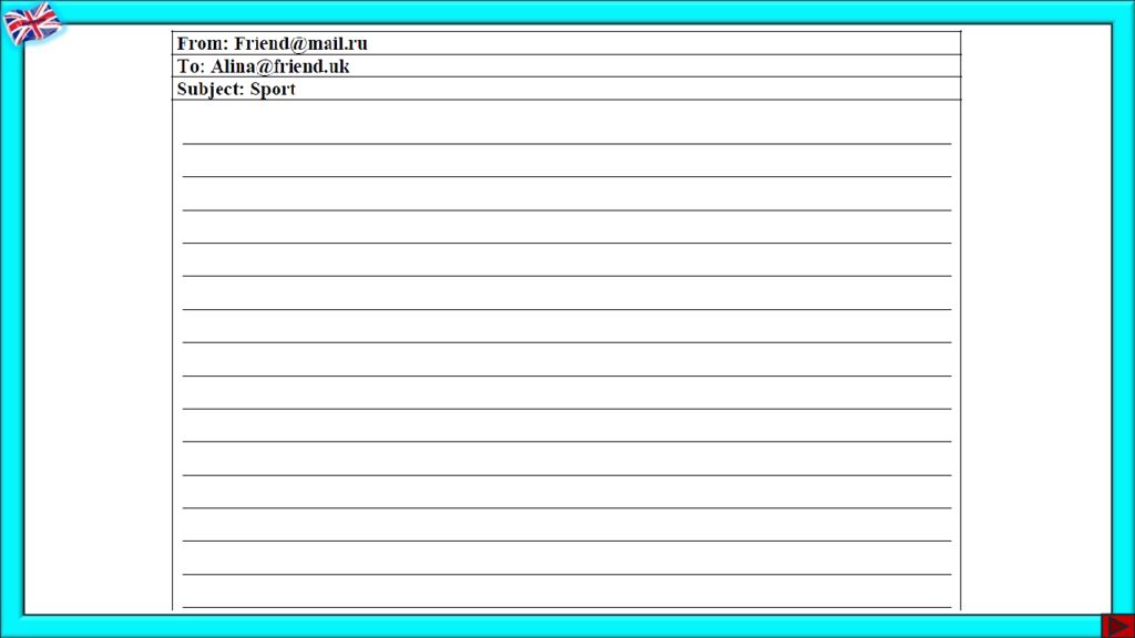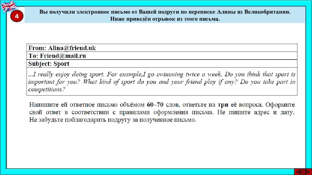 4 Вы получили электронное письмо от Вашей подруги по переписке Алины из Великобритании. Ниже приведён отрывок из этого письма.