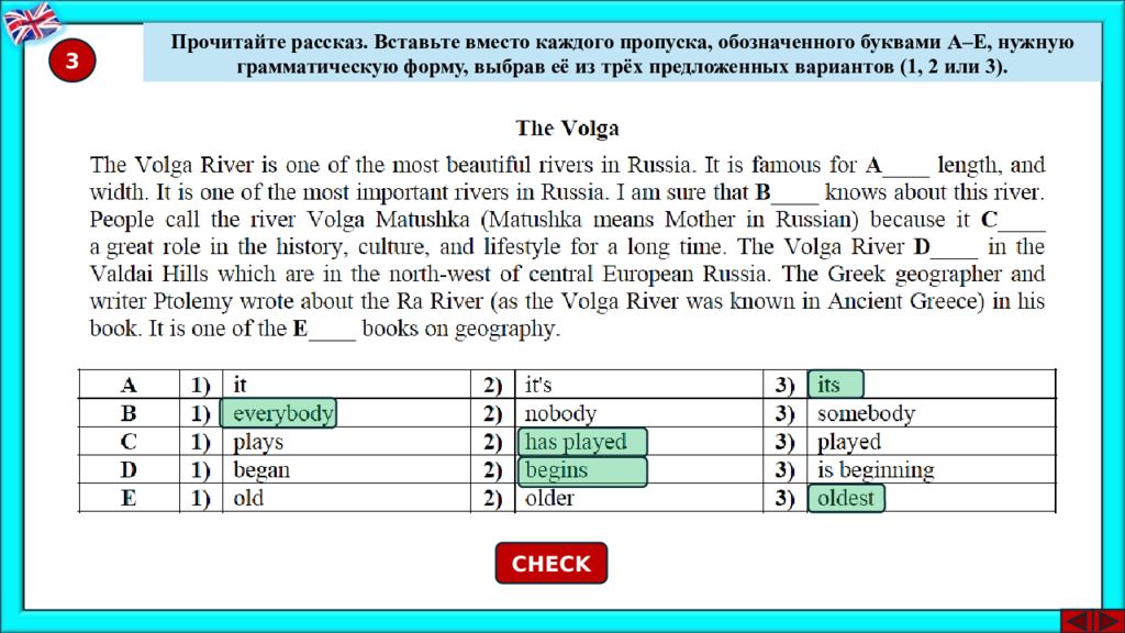 3 CHECK Прочитайте рассказ. Вставьте вместо каждого пропуска, обозначенного буквами А–Е, нужную грамматическую форму, выбрав её из трёх предложенных вариантов (1, 2 или 3).