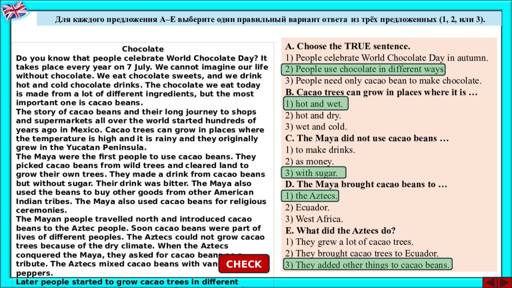 A. Choose the TRUE sentence. 1) People celebrate World Chocolate Day in autumn. 2) People use chocolate in different ways. 3) People need only cacao bean to make chocolate. B. Cacao trees can grow in places where it is … 1) hot and wet. 2) hot and dry. 3) wet and cold. C. The Maya did not use cacao beans … 1) to make drinks. 2) as money. 3) with sugar. D. The Maya brought cacao beans to … 1) the Aztecs. 2) Ecuador. 3) West Africa. E. What did the Aztecs do? 1) They grew a lot of cacao trees. 2) They brought cacao trees to Ecuador. 3) They added other things to cacao beans. Для каждого предложения А–Е выберите один правильный вариант ответа из трёх предложенных (1, 2, или 3 ). Chocolate Do you know that people celebrate World Chocolate Day? It takes place every year on 7 July. We cannot imagine our life without chocolate. We eat chocolate sweets, and we drink hot and cold chocolate drinks. The chocolate we eat today is made from a lot of different ingredients, but the most important one is cacao beans. The story of cacao beans and their long journey to shops and supermarkets all over the world started hundreds of years ago in Mexico. Cacao trees can grow in places where the temperature is high and it is rainy and they originally grew in the Yucatan Peninsula. The Maya were the first people to use cacao beans. They picked cacao beans from wild trees and cleared land to grow their own trees. They made a drink from cacao beans but without sugar. Their drink was bitter. The Maya also used the beans to buy other goods from other American Indian tribes. The Maya also used cacao beans for religious ceremonies. The Mayan people travelled north and introduced cacao beans to the Aztec people. Soon cacao beans were part of lives of different peoples. The Aztecs could not grow cacao trees because of the dry climate. When the Aztecs conquered the Maya, they asked for cacao beans as a tribute. The Aztecs mixed cacao beans with vanilla or chili peppers. Later people started to grow cacao trees in different countries. For example, Ecuador was for a long time the world’s number-one producer of cocoa beans. It is still one of the top ten producers of the beans, but nowadays more than 70 per cent of cocoa beans come from West Africa. CHECK