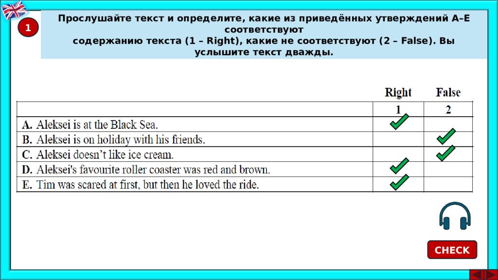 CHECK 1 Прослушайте текст и определите, какие из приведённых утверждений A–E соответствуют содержанию текста (1 – Right ), какие не соответствуют (2 – False ). Вы услышите текст дважды.