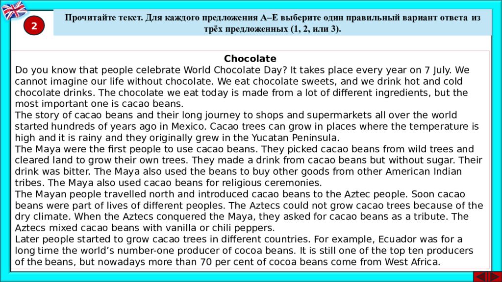 2 Прочитайте текст. Для каждого предложения А–Е выберите один правильный вариант ответа из трёх предложенных (1, 2, или 3 ). Chocolate Do you know that people celebrate World Chocolate Day? It takes place every year on 7 July. We cannot imagine our life without chocolate. We eat chocolate sweets, and we drink hot and cold chocolate drinks. The chocolate we eat today is made from a lot of different ingredients, but the most important one is cacao beans. The story of cacao beans and their long journey to shops and supermarkets all over the world started hundreds of years ago in Mexico. Cacao trees can grow in places where the temperature is high and it is rainy and they originally grew in the Yucatan Peninsula. The Maya were the first people to use cacao beans. They picked cacao beans from wild trees and cleared land to grow their own trees. They made a drink from cacao beans but without sugar. Their drink was bitter. The Maya also used the beans to buy other goods from other American Indian tribes. The Maya also used cacao beans for religious ceremonies. The Mayan people travelled north and introduced cacao beans to the Aztec people. Soon cacao beans were part of lives of different peoples. The Aztecs could not grow cacao trees because of the dry climate. When the Aztecs conquered the Maya, they asked for cacao beans as a tribute. The Aztecs mixed cacao beans with vanilla or chili peppers. Later people started to grow cacao trees in different countries. For example, Ecuador was for a long time the world’s number-one producer of cocoa beans. It is still one of the top ten producers of the beans, but nowadays more than 70 per cent of cocoa beans come from West Africa.