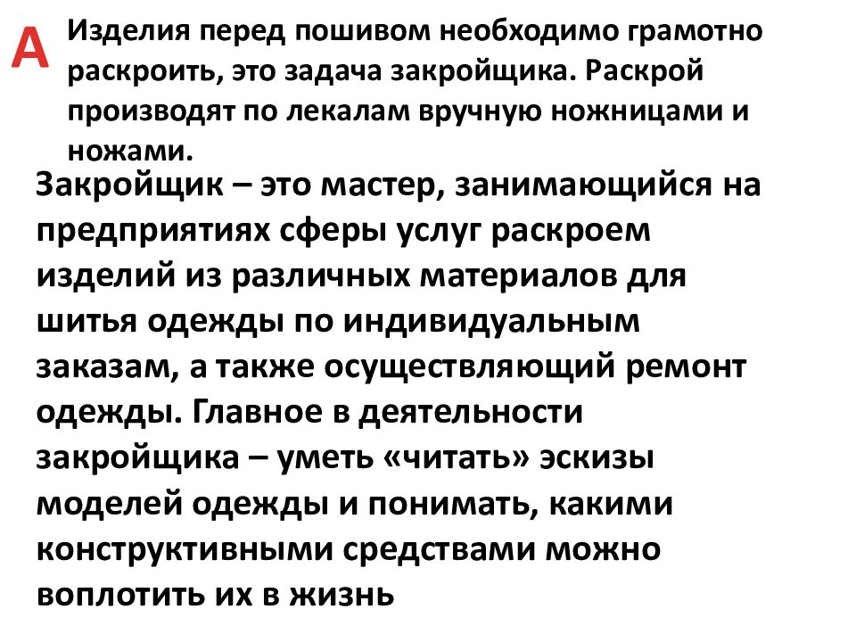 А Изделия перед пошивом необходимо грамотно раскроить, это задача закройщика. Раскрой производят по лекалам вручную ножницами и ножами. Закройщик – это мастер, занимающийся на предприятиях сферы услуг раскроем изделий из различных материалов для шитья одежды по индивидуальным заказам, а также осуществляющий ремонт одежды. Главное в деятельности закройщика – уметь «читать» эскизы моделей одежды и понимать, какими конструктивными средствами можно воплотить их в жизнь