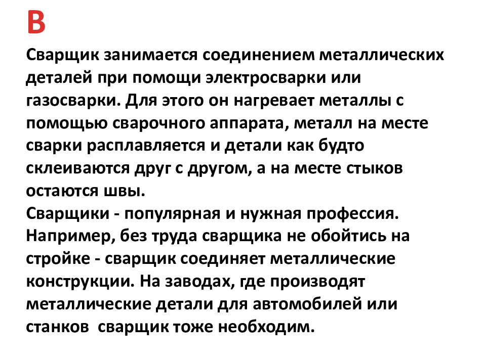 Сварщик занимается соединением металлических деталей при помощи электросварки или газосварки. Для этого он нагревает металлы с помощью сварочного аппарата, металл на месте сварки расплавляется и детали как будто склеиваются друг с другом, а на месте стыков остаются швы. Сварщики - популярная и нужная профессия. Например, без труда сварщика не обойтись на стройке - сварщик соединяет металлические конструкции. На заводах, где производят металлические детали для автомобилей или станков сварщик тоже необходим. В