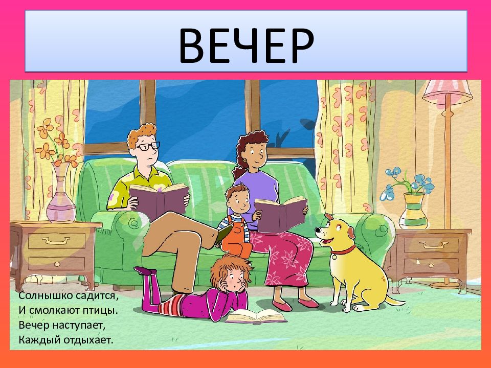 Солнышко садится, И смолкают птицы. Вечер наступает, Каждый отдыхает.