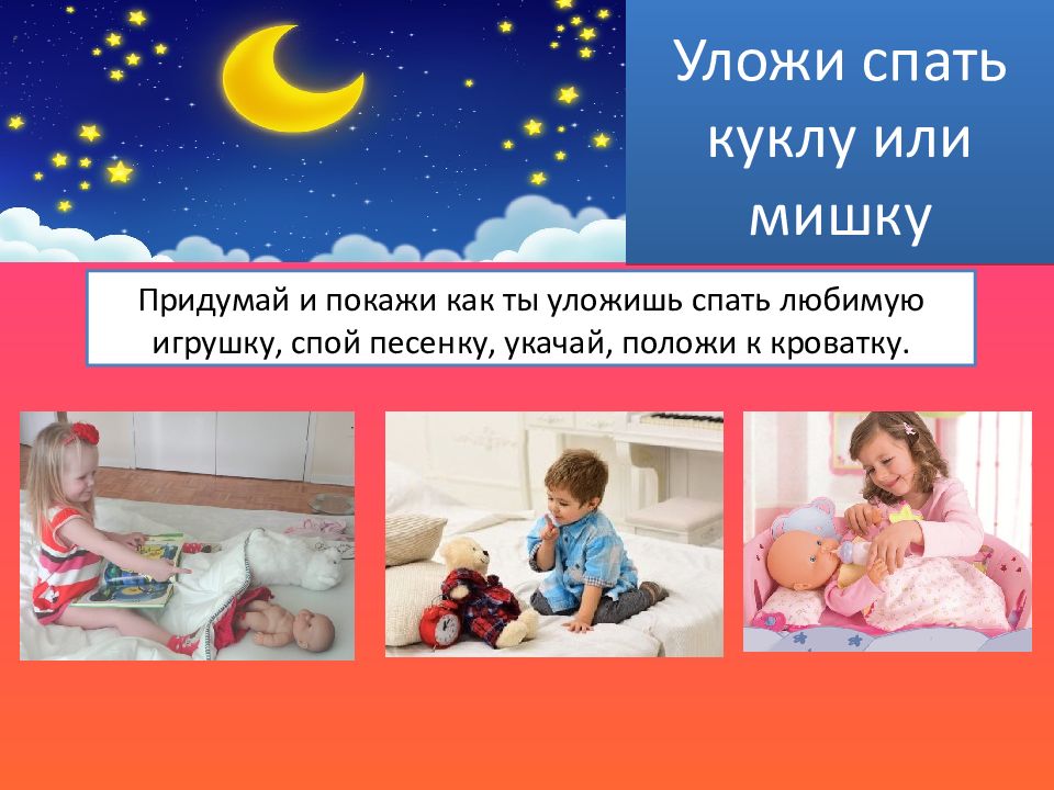 Придумай и покажи как ты уложишь спать любимую игрушку, спой песенку, укачай, положи к кроватку.