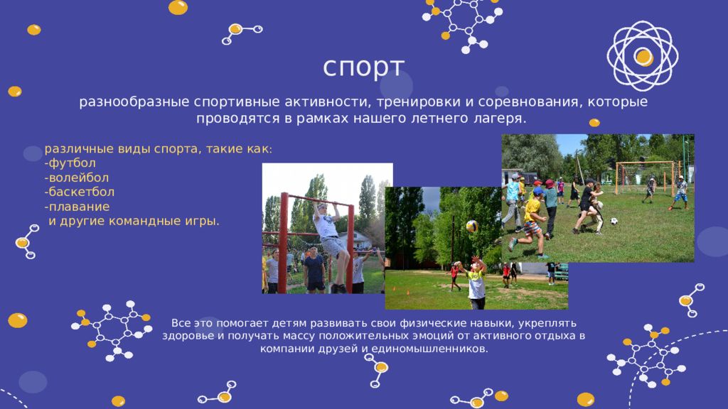 различные виды спорта, такие как : -футбол -волейбол -баскетбол -плавание и другие командные игры. разнообразные спортивные активности, тренировки и соревнования, которые проводятся в рамках нашего летнего лагеря. Все это помогает детям развивать свои физические навыки, укреплять здоровье и получать массу положительных эмоций от активного отдыха в компании друзей и единомышленников.